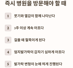 대부분의 발가락 통증은 휴식·신발 교체·스트레칭으로 좋아지지만 아래 상황이라면 진료가 필요합니다.