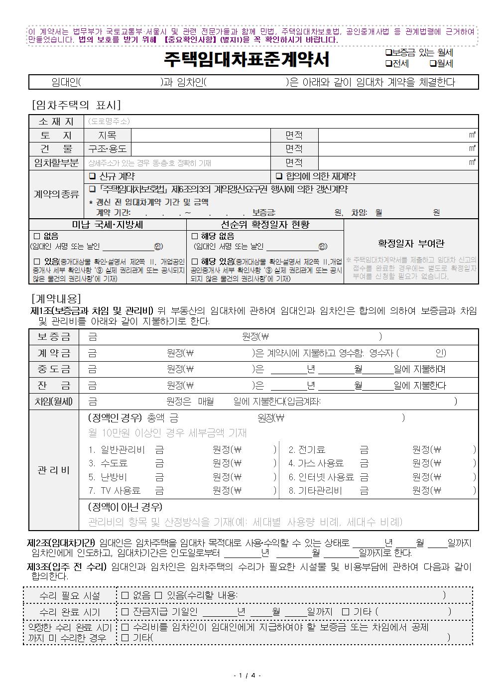 부동산 표준 임대차계약서 양식 무료다운 받기