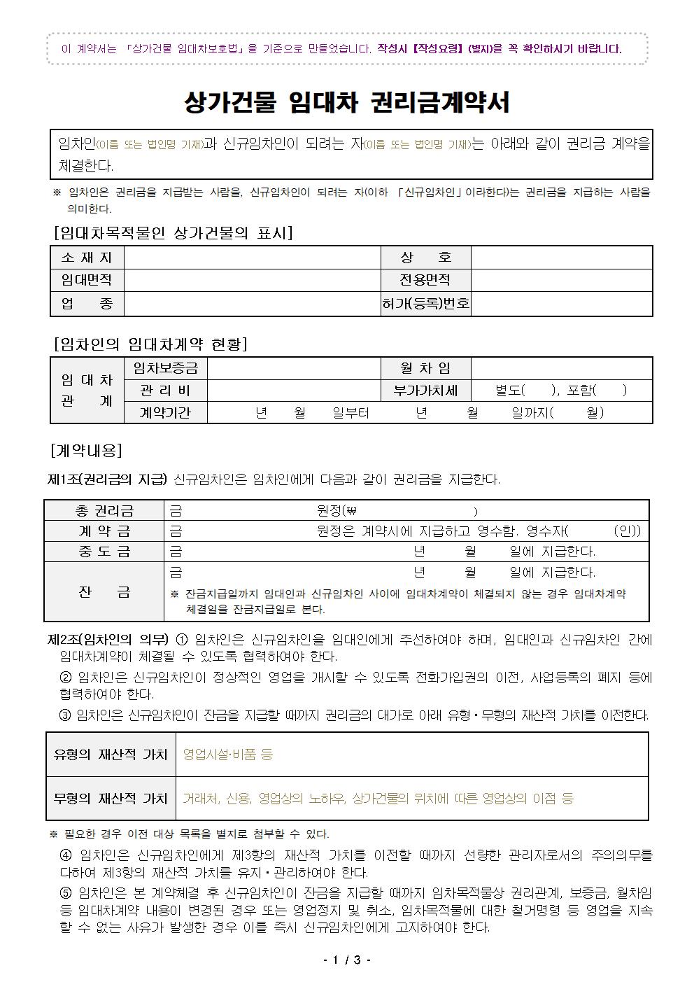 상가 권리금 표준계약서 양식입니다. 총 2페이지로 구성되어 있으며 아래의 이미지는 3페이중 1번째 페이지입니다.