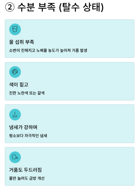 하루 1.5~2L 정도의 수분을 규칙적으로 마시면 대부분의 생활성 거품은 금방 줄어듭니다.