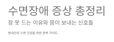 수면장애의 증상은 크게 잠들기 어려움 · 자주 깸 · 자도 피곤함 · 수면 중 행동·호흡 문제 · 감정 변화로 나눌 수 있습니다. 단순한 수면 부족이 아니라 생활 전반에 영향을 미치는 중요한 신호이기 때문에, 증상이 계속된다면 반드시 원인을 점검해야 합니다.