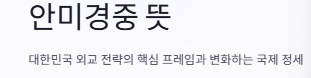 - 안미(安美): "안보는 미국에 의존한다"는 의미입니다. 6·25 전쟁 이후 굳건히 유지되어 온 한미동맹을 바탕으로 국가의 안전을 보장받는 것을 뜻합니다.