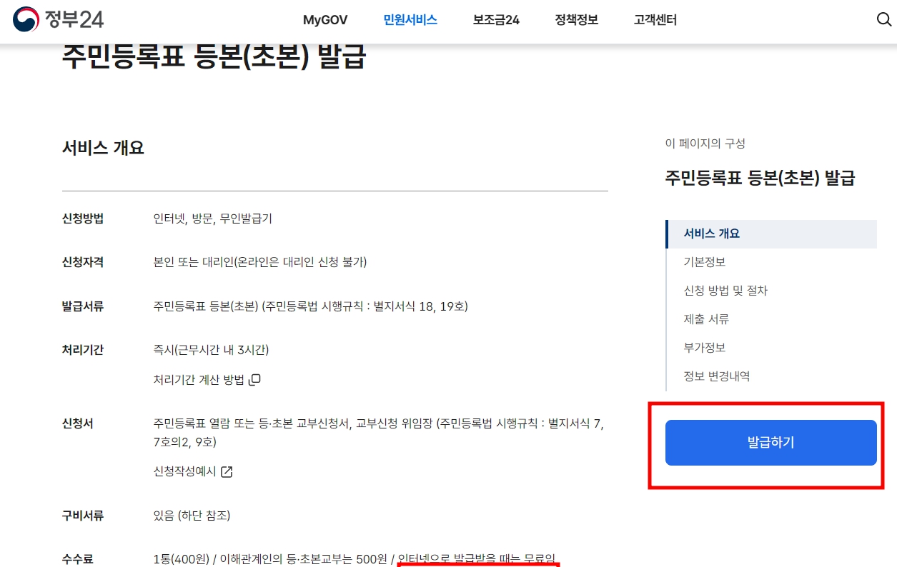 주민센터에서 직접 발급을 받으면 400원의 수수료가 들지만, 인터넷으로 발급받을 때는 무료입니다.