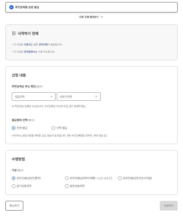 다른 유형을 클릭하면 아래와 같이 주민등록표 초본 발급을 선택하시고,