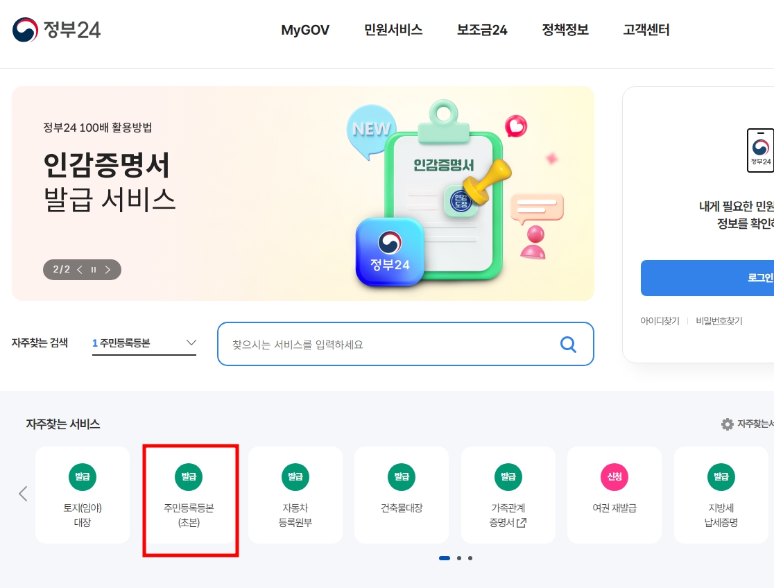 아래의 이미지에 있는 자주 찾는 서비스 쪽의 주민등록등본(초본)을 클릭합니다.