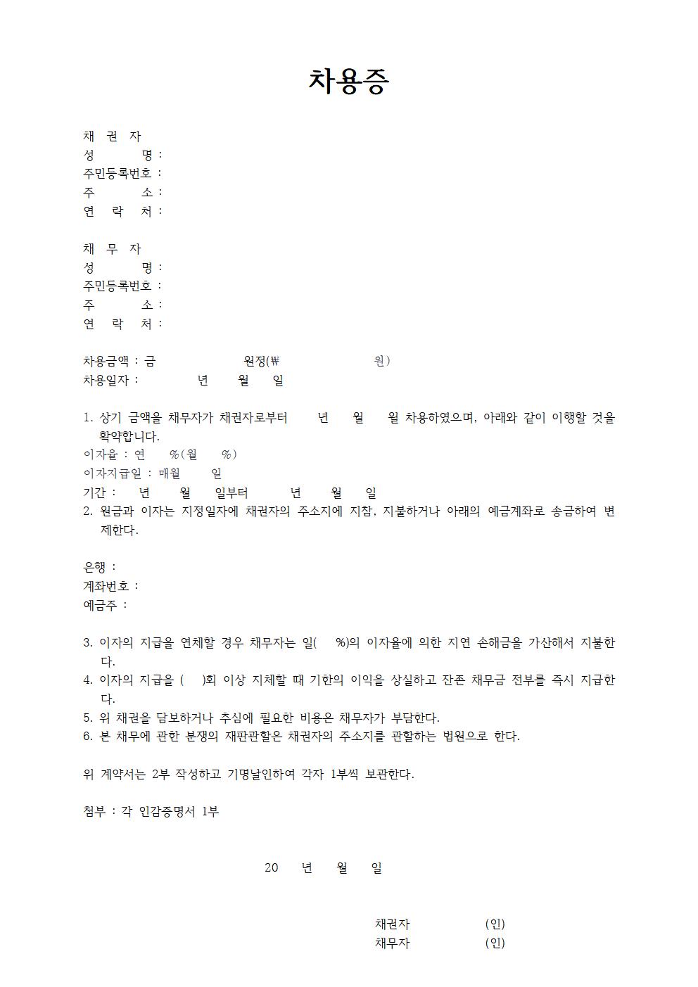 정확한 차용증 작성으로 분쟁이 생기시지 않으시길 바랍니다.